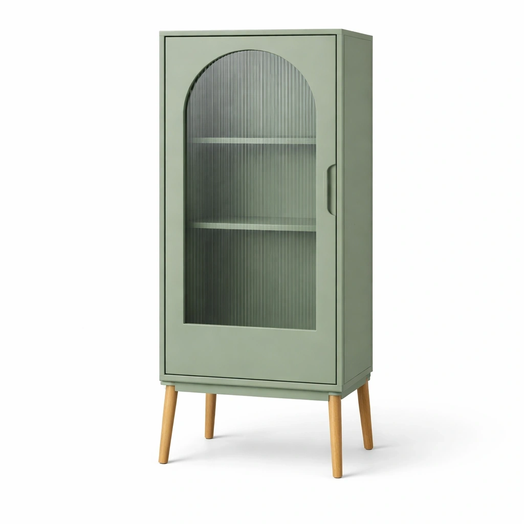 decrire:Structure verte etageres internes porte verre pieds bois naturel stabilite elevee ideale pour rangement et exposition objets decoratifs usage salon chambre durable fonctionnel