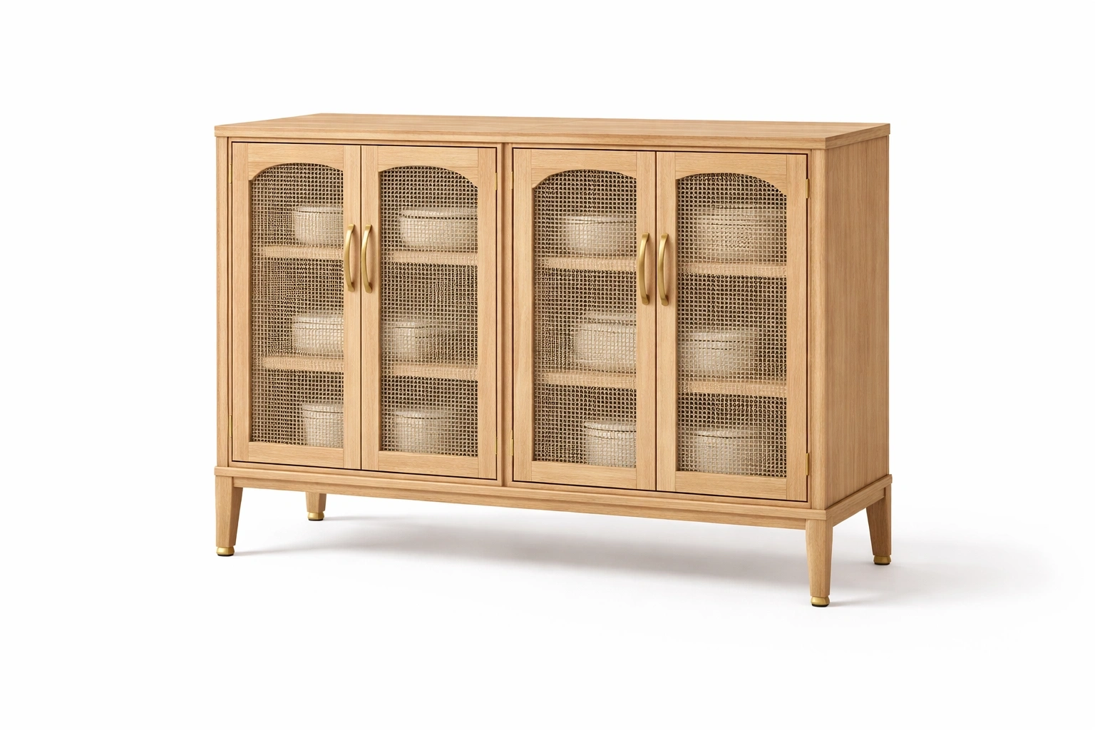 decrire:Portes cannage structure bois clair etageres internes rangement vaisselle accessoires design naturel elegant stabilite elevee ideal salon salle a manger usage quotidien durable pratique
