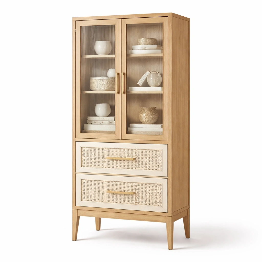 decrire:Structure bois clair portes verre tiroirs cannage rangement combine ouvert et ferme ideal pour vaisselle livres objets decoratifs design naturel chaleureux stabilite elevee usage salon salle a manger durable pratique